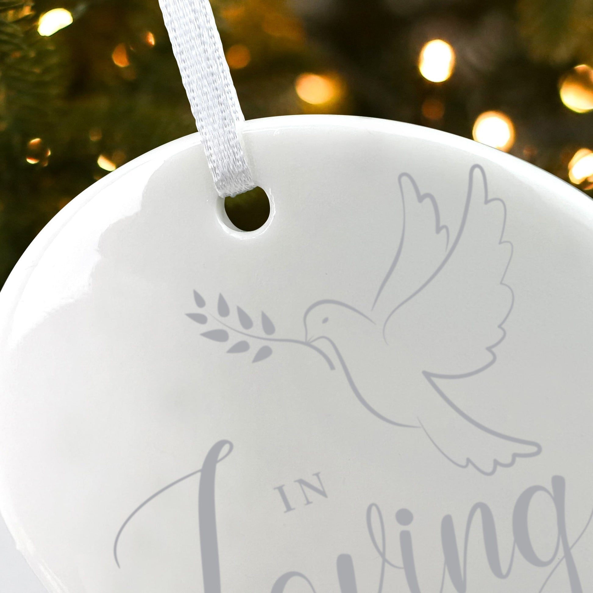 Keep your loved one close during the festive season with this meaningful ceramic hanging decoration. Crafted with a graceful dove and "In Loving Memory" message, it's a gentle way to include them in your Christmas celebrations. Personalise it with one line of text that flows beautifully around the base, making it uniquely yours. This thoughtful keepsake arrives ready to give in an elegant gift box, offering comfort and connection during a time when their absence is felt most deeply.