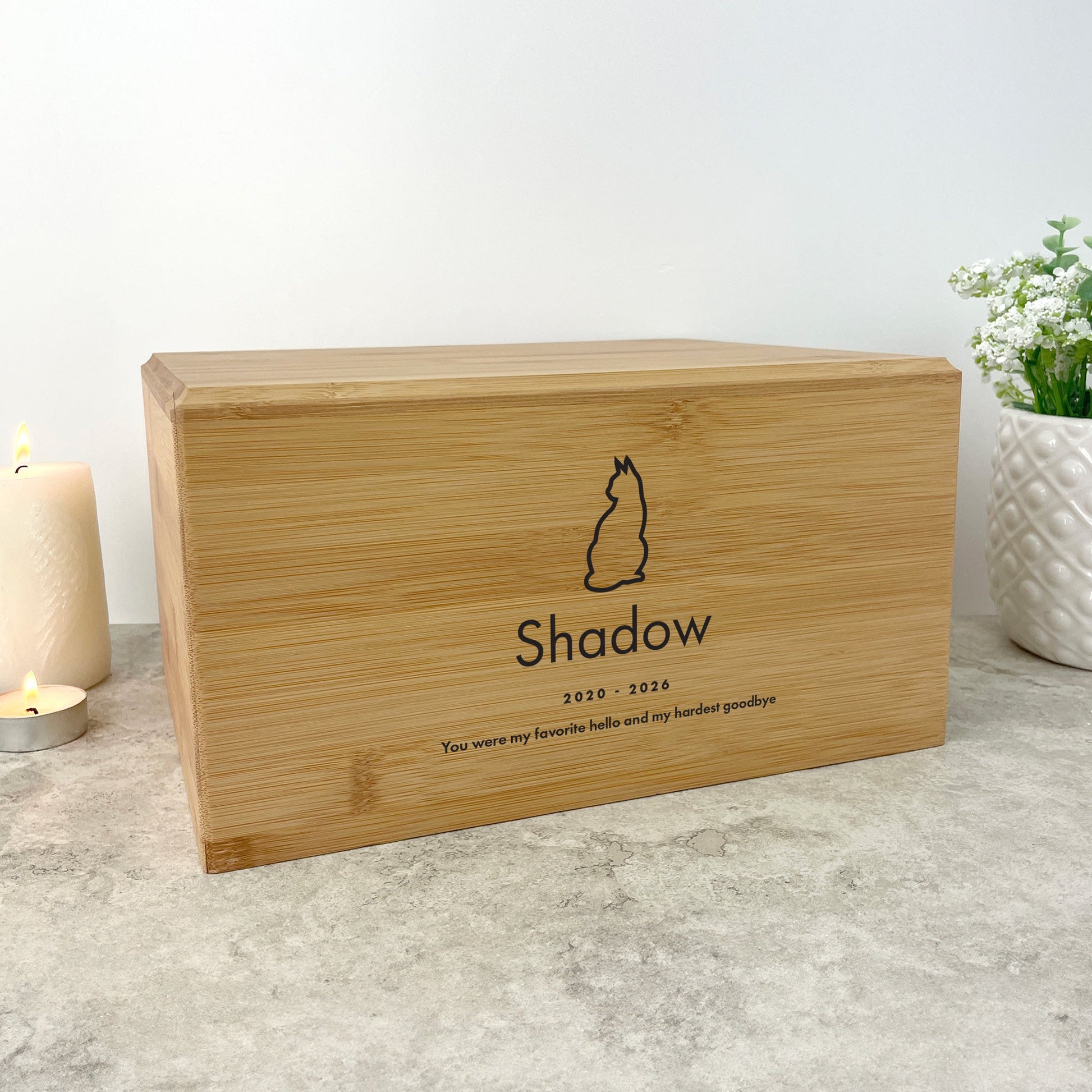 A beautiful way to remember your beloved pet. This personalised bamboo urn features a paw print or cat design, UV-printed with your pet's details. Crafted from sustainable bamboo, it offers a warm, natural aesthetic that honours their memory with both elegance and environmental responsibility. A lasting tribute to the companionship you shared.