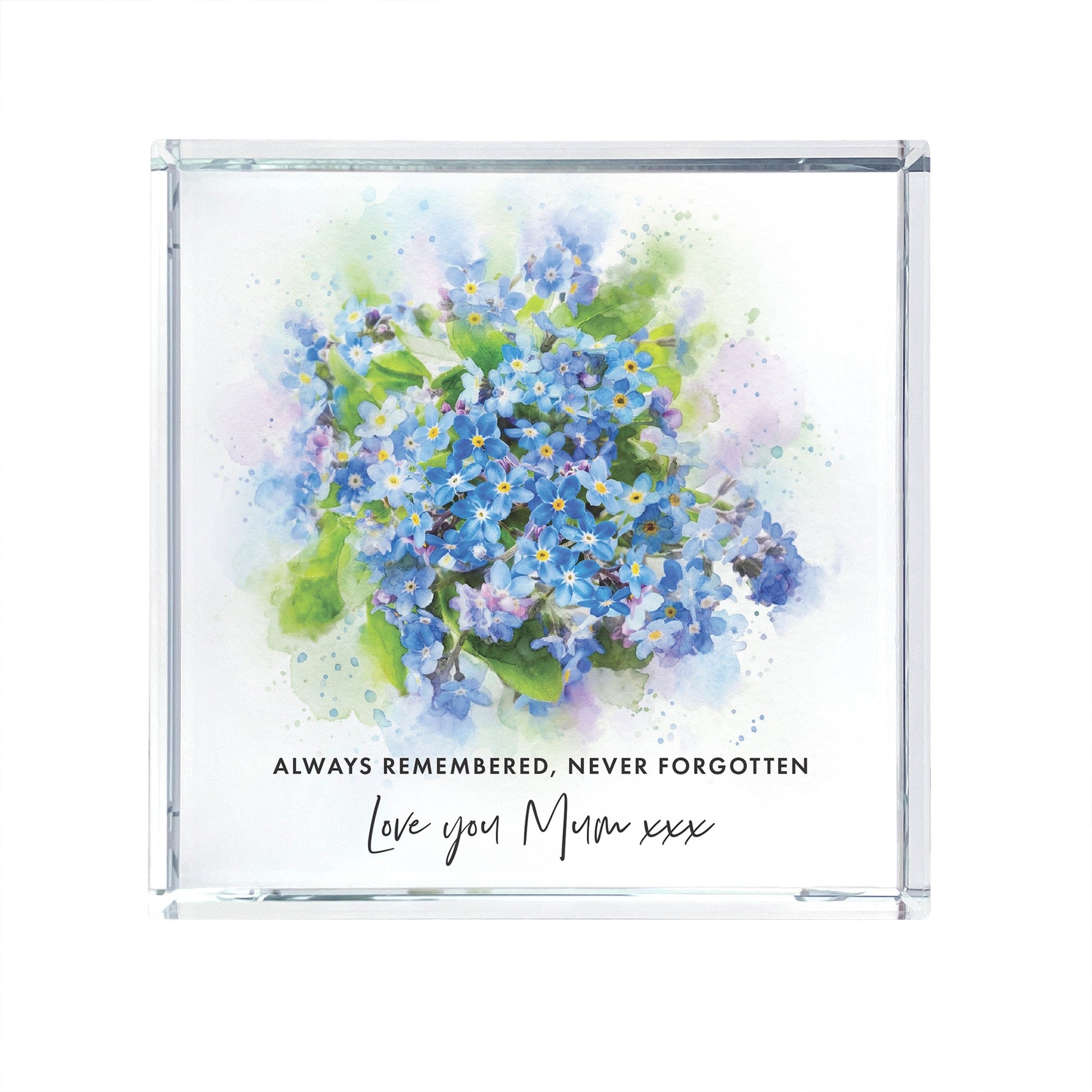 Create a timeless keepsake with our personalised Forget-Me-Not crystal token, beautifully finished with a soft watercolour-effect floral design. Featuring delicate blue forget-me-not flowers, this elegant crystal piece symbolises remembrance, love, and lasting connection, making it a meaningful gift for any occasion.