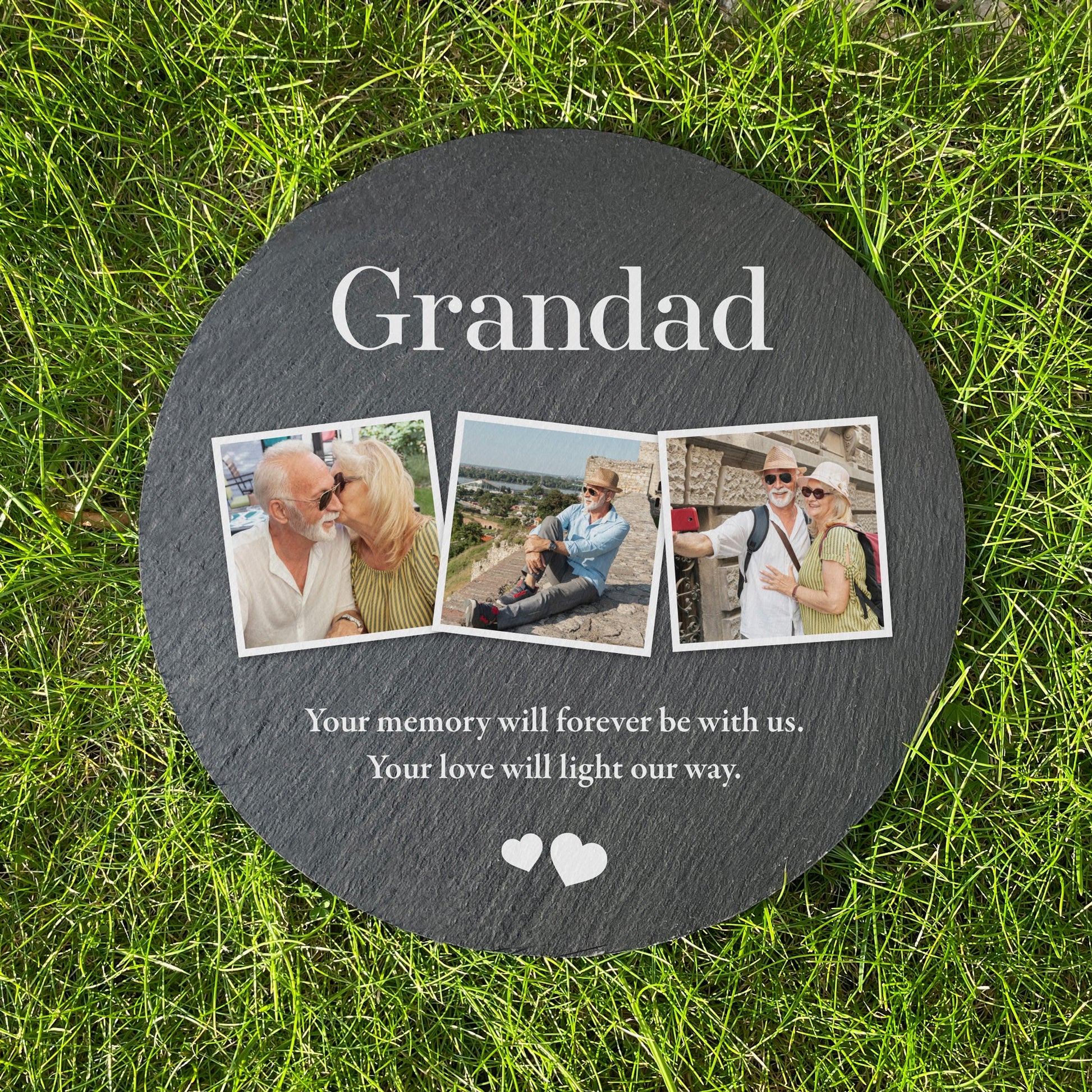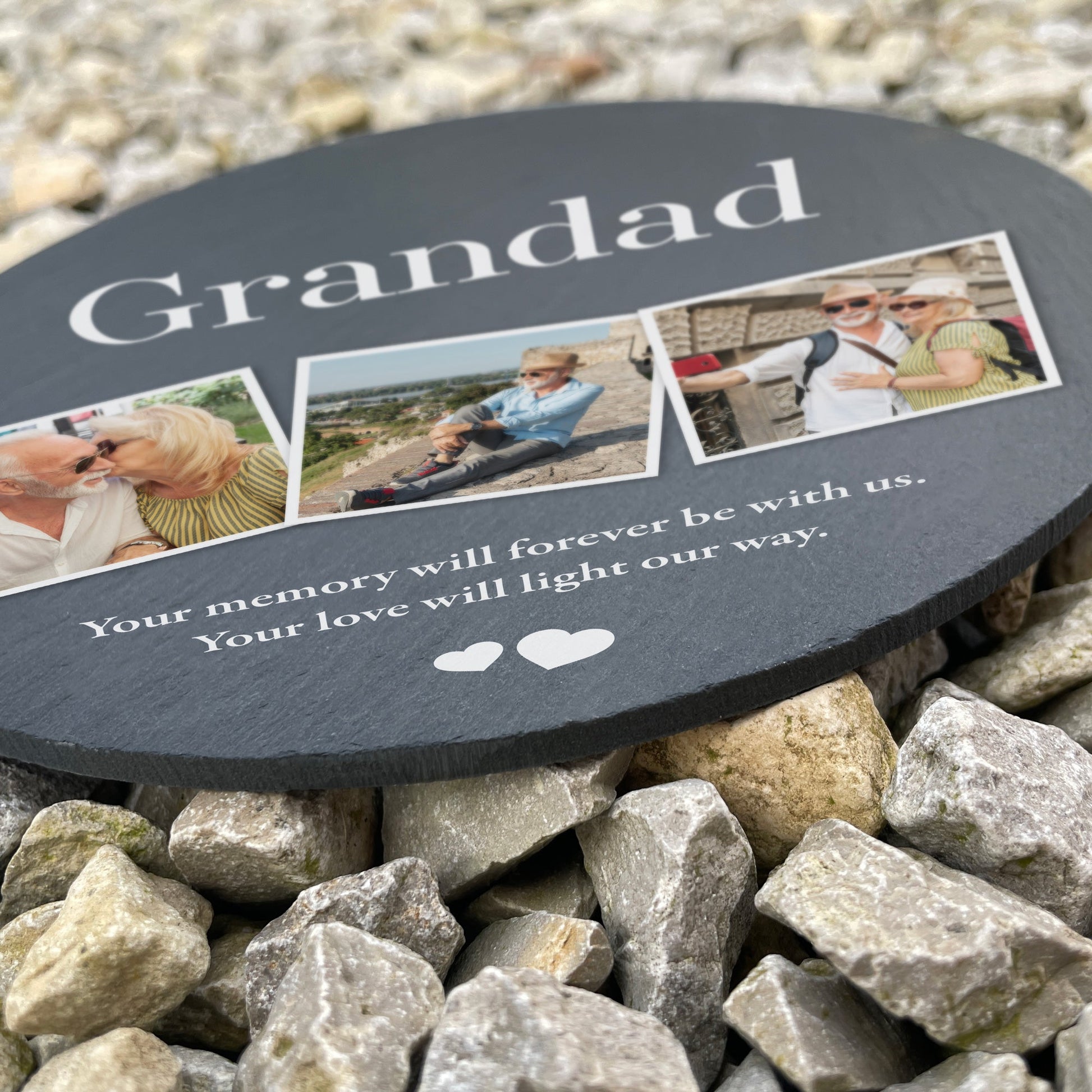 Honour the memory of someone special with this circular slate grave marker, personalised with three cherished photographs, their name, and a meaningful two-line inscription of your choice. Crafted from durable slate, this timeless tribute provides a lasting way to celebrate their life and keep their memory close to your heart.