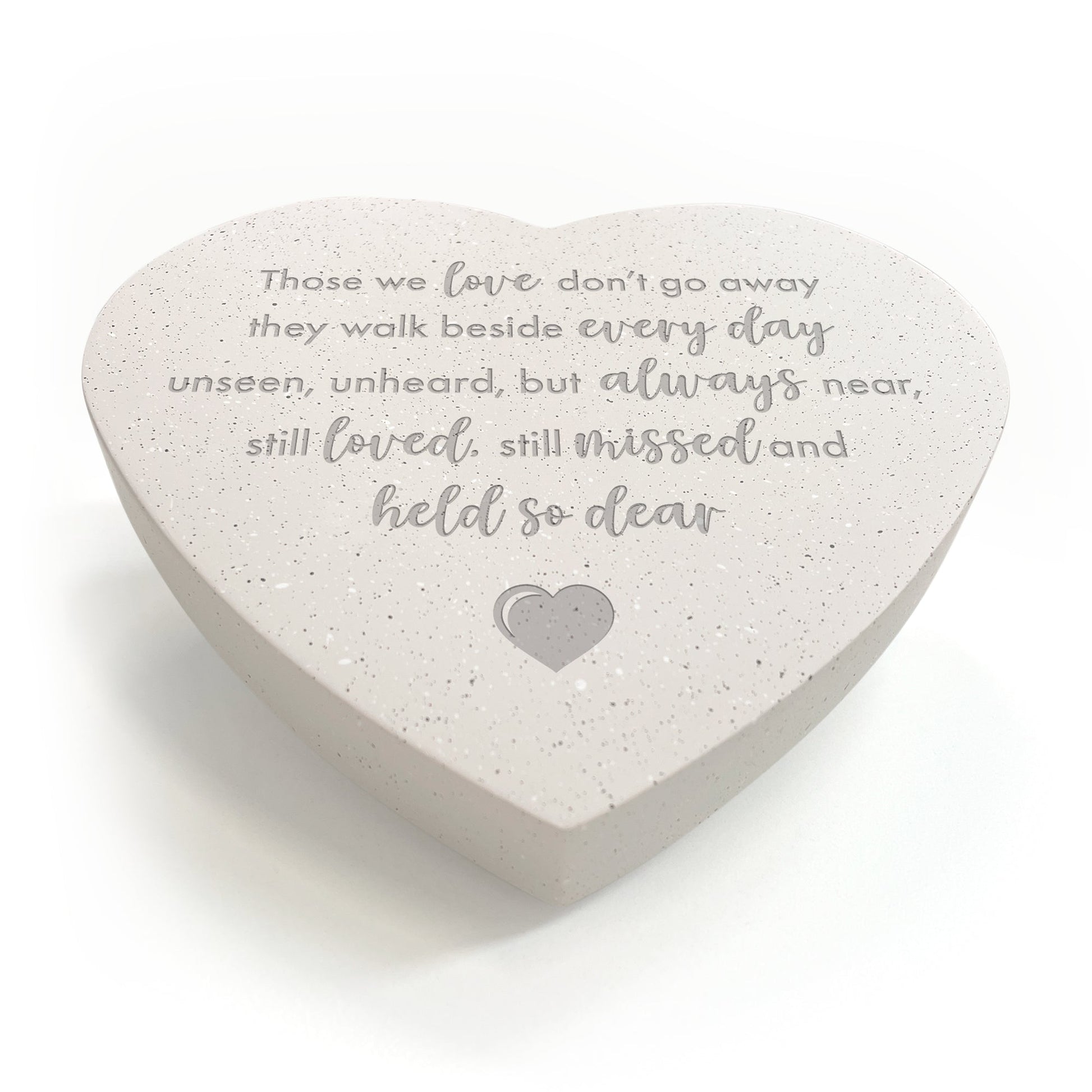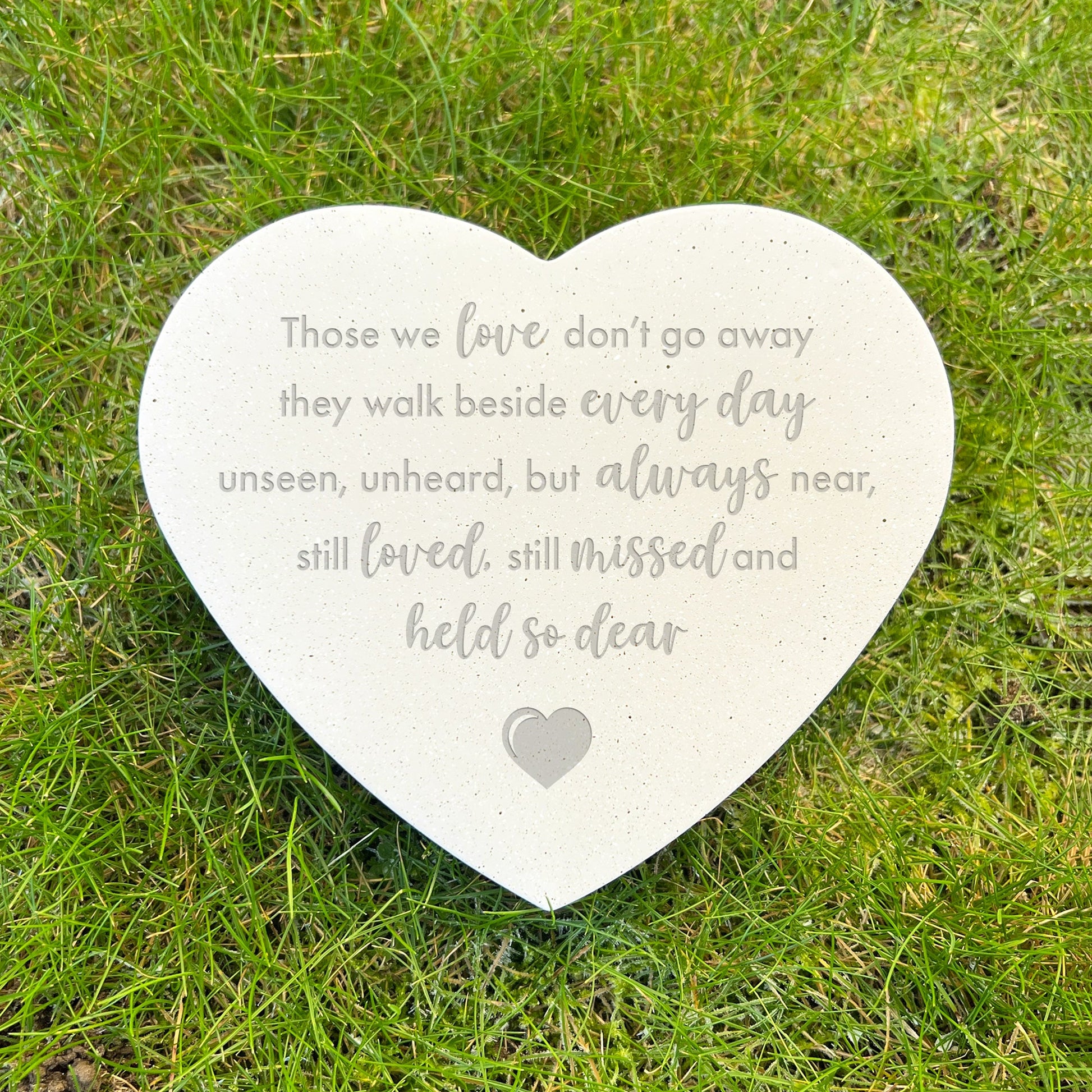 Crafted from durable, weather-resistant material, it withstands the elements while preserving its graceful appearance season after season. The modern heart design is engraved with a meaningful verse "Those we love don't go away, they walk beside us every day unseen, unheard but always near, still loved, still missed and held so dear" offering gentle comfort during moments of reflection.